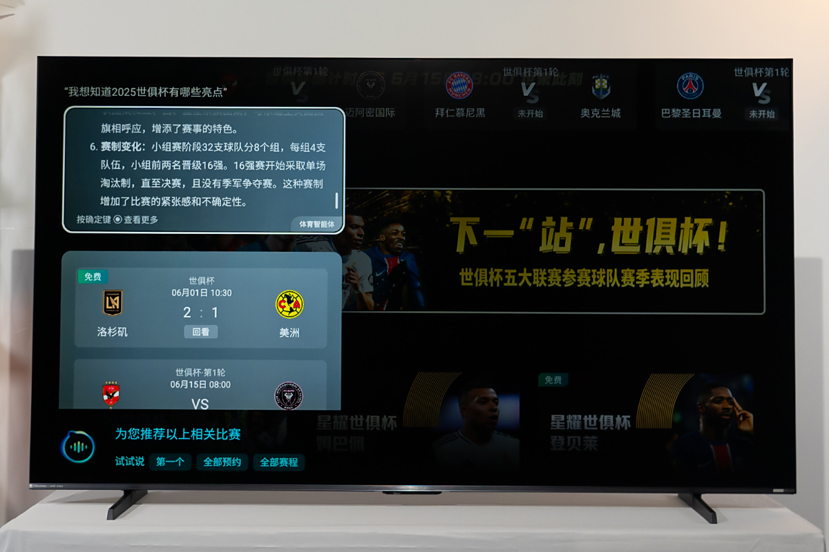 与此同时,基于海信星海大模型的音视频理解和数据处理能力以及世俱杯官方授权的独家权益数据,E5Q Pro的体育智能体能够在赛前和球迷们一起预测比赛,而且作为“资深球友”可以结合球队近况、球员表现等多个维度的数据给出赛事胜负分析,让你在与好友打赌时占得先机;在比赛过程中,智能体还可以给出战术拆解,也可以识别双方球员,给出相关介绍,增加观赛陪伴和代入感;赛后AI还能复盘比赛,把各种信息综合起来,让客厅秒变绿茵场,观赛体验得到全面升级。