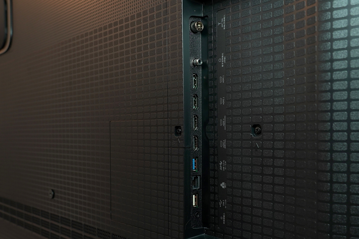 丰富接口满血加持:E5Q Pro的接口位于左侧背部,自上而下分别为天线、同轴接口、2个HDMI、2个HDMI2.1@144Hz(可兼容4K@150Hz刷新率)、USB 3.0、网口、USB 2.0、音视频输入。可以同时连接盒子、电脑、游戏主机、存储等多款设备,减少插拔次数,随时切换。