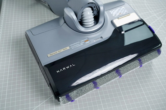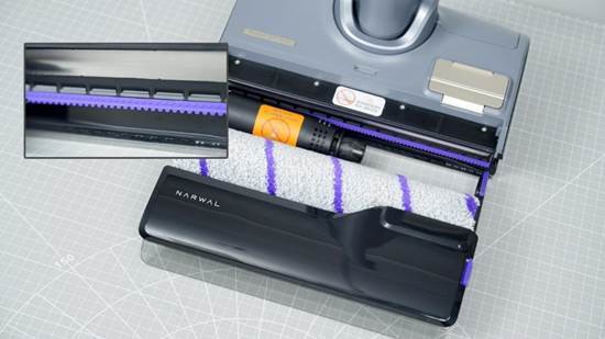 ??洗地机背面十分平整,滚刷与机体之间设计有一条透明的刮条,洗地时能让脏污更快吸入,也能让多余的水分刮走,清洁更加安全,也能保护木地板。