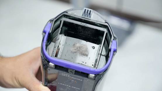 ??污水箱采用卡口设计,能轻松拿出来。由于采用全链路风干设计,固体脏污风干后会留在过滤器上面,而污水则在下方,实现干湿分离。用户清洁污水箱的时候非常简单,风干后的固体脏污和污水都能直接倒掉,然后冲一下就行。