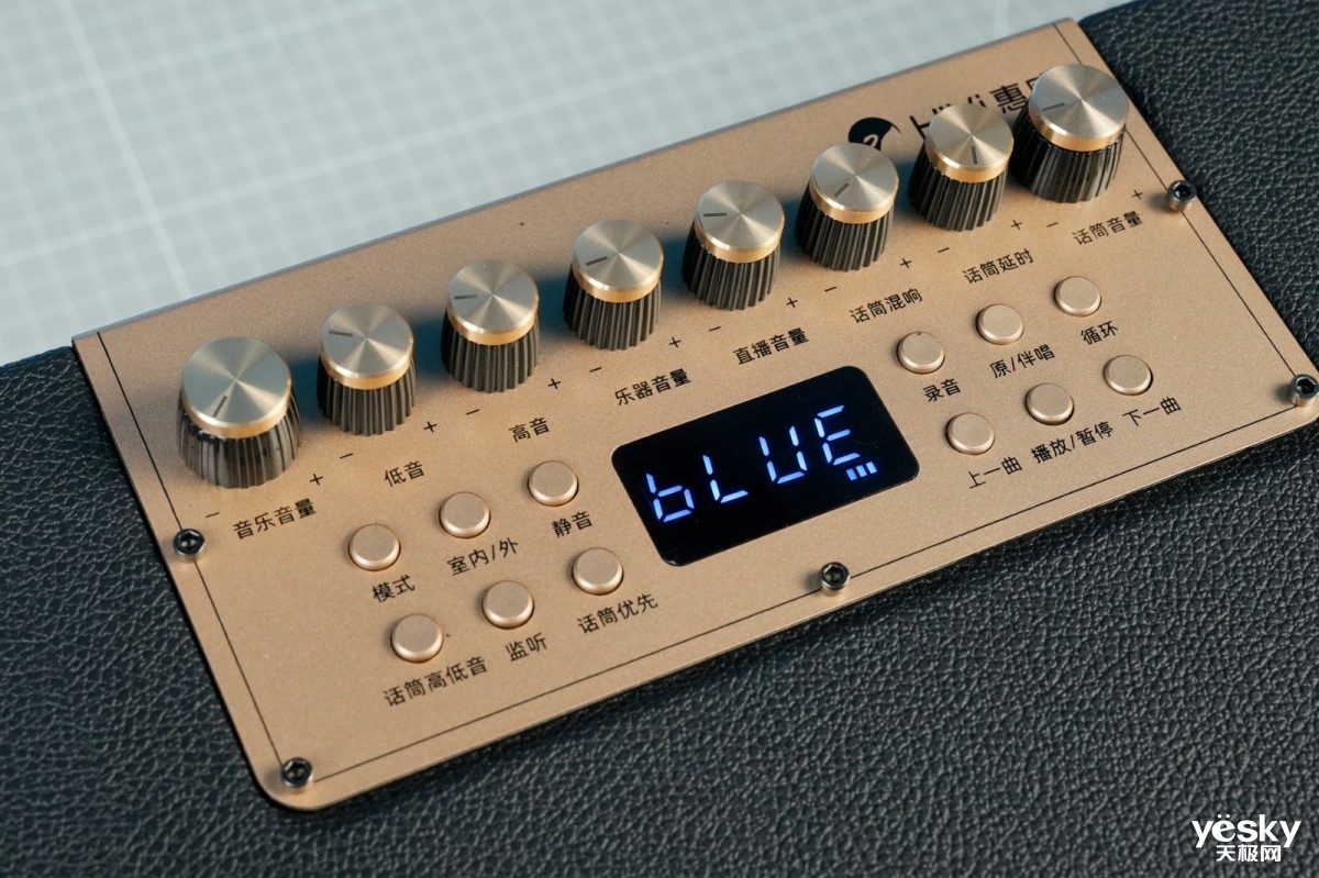 来到机身顶部,除了有蓝牙配对键,还配置了音量、低音和高音三个指针式旋钮,可调节自己喜好的音效,最右边则是电量指示灯。同时,防荔枝皮革纹理材质包裹的机身,手感舒适,边角还配有嵌入式护角设计,可降低音箱磕碰损坏的风险。