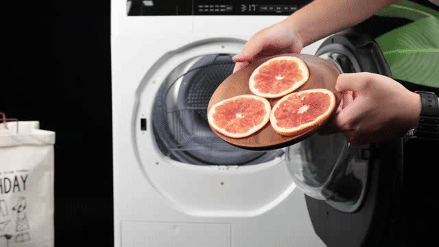这还不够,既然惠而浦W1易净干衣机能够“解冻”,那么它能够“收干水分”吗?我们将西柚切片放入干衣机中,观察烘干前后西柚片上的水分情况。