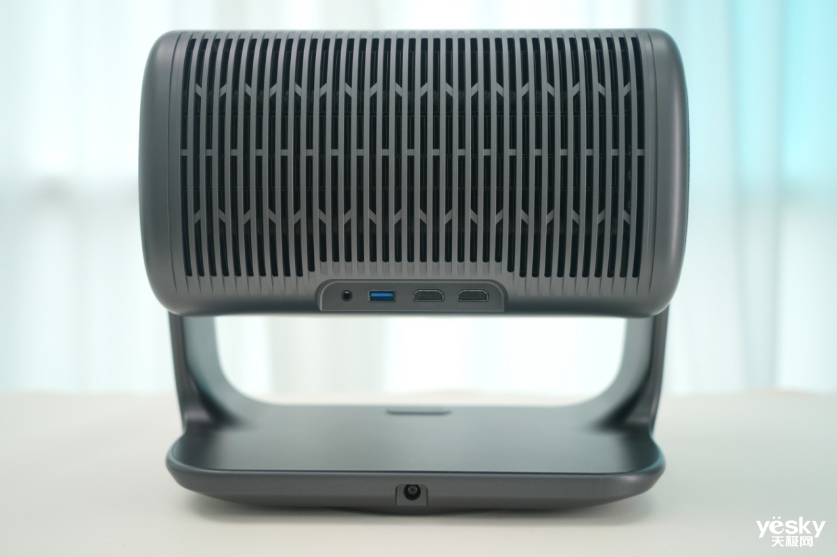 机身背面接口部分包含了一个 3.5 毫米耳机插孔、一个 USB3.0 接口以及两个 HDMI2.1 接口(含 1 个 eARC),支持连接电脑、游戏主机(switch/PS5/XBOX等)、音视频设备。背面跟底部的散热出风区域采用分体式散热,还能智能调控,强悍散热全面无死角。还有一个比较贴心的设计是将电源接口与云台底座融为一体,这样在调整投影仪角度时,不会压到或拉扯到电源线,实现天花板观影自由。