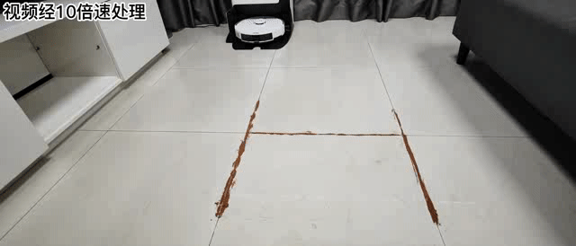 ??我们模拟日常地面容易出现的餐食污渍进行测试。首先在地面上洒下酱油,随后使用石头G10?Plus进行清洁。我们对酱油所在的区域设定划区清洁,可以看到,石头G10?Plus以“弓字形”进行扫拖,虽然机器人万向轮和行走轮在经过酱油时会产生一道“酱油印”,但是石头G10?Plus在往返拖地的过程中再次将痕迹擦净,地面上基本上已无酱油残留。