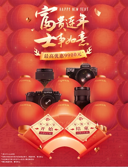 现在正值京东年货节期间,即日起-1月31日,加入富士“富贵连年,士事如意”活动,最高优惠可享9900元。富士X-H2到手价13390元!