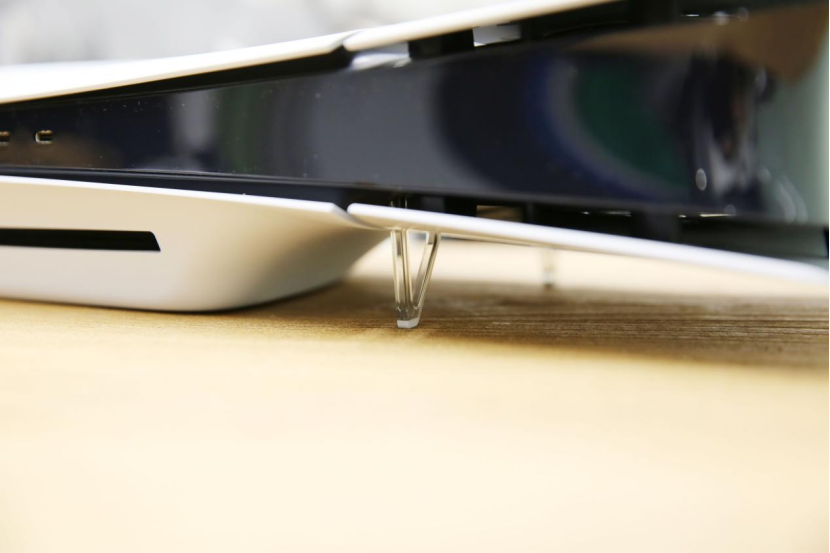 当然,如果玩家希望将PS5 轻薄版直立摆放的话需要购置一个直立支架,直立支架的安装也很方便,配件的安装说明书简洁明了,只需要将底座对好后拧上螺丝即可。