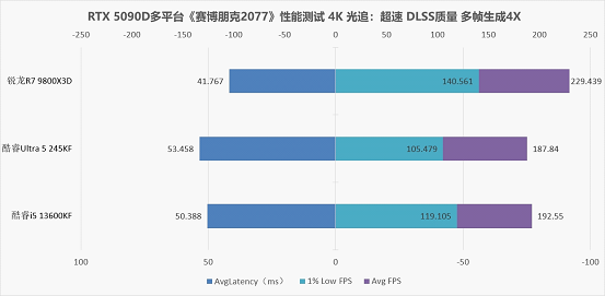 平均延迟方面,9800X3D拿下245KF是毫无悬念的,Ultra200不仅NV不推荐,连存储厂商也不推荐用这个平台测试,还得期待intel的16代好好发力了。好在Z790平台的13600K挣了一口气,无论是平均延迟、1%LOW帧都全面优胜,平均帧的差距也只能用误差来形容。这么看来,难道我们只要换5090显卡就完事了?