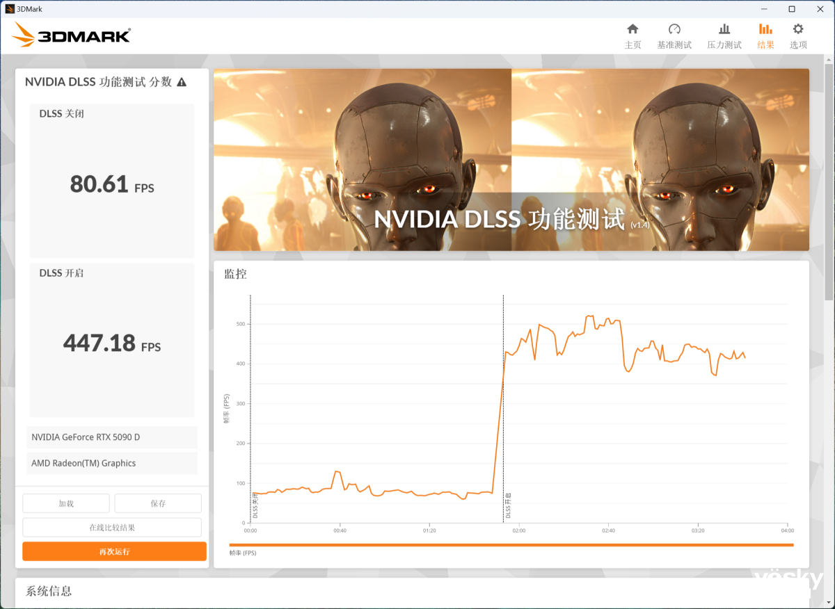 我们简单过一下基准测试,开启了DLSS 4X模式后帧率从80帧暴涨到447帧,通过AI加持带来5.5倍的性能提升,真是炸裂。Time Spy是48220分,而4090大概是36000分左右。Fire Strike Extreme拿到了53862分,4090大概是46000分左右。Port Royal拿到了36092分,4090大概是25000分左右。基准测试方面相对4090有30%-40%以上的巨大提升。