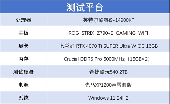 我们来看一下本次测试的平台。处理器为第14代英特尔酷睿i9-14900KF,主板选用ROG STRIX Z790-E Gaming WIFI,拥有满血PCIe 5.0 M.2 SSD接口;我们选择搭配32GB的Crucial DDR5 Pro 6000MHz高频内存,保证希捷酷玩540能发挥出它应有的性能。