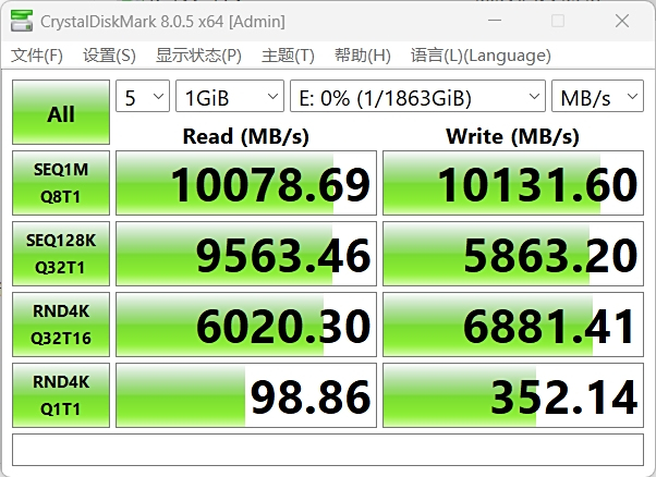 我们正式进入测试。CrystalDiskMark 8.0.5软件测试中,希捷酷玩540的顺序读写速度和写入速度方面相较于PCIe 4.0 SSD有了大幅提升,其顺序读取速度能够达到10078.69MB/s,写入速度甚至能够达到10131.6MB/s。通常来说,顶级PCIe 4.0 SSD的顺序读取速度会在7.4GB/s、写入速度在7GB/s左右,PCIe 5.0相较于PCIe 4.0 SSD的代际优势体现得淋漓尽致。