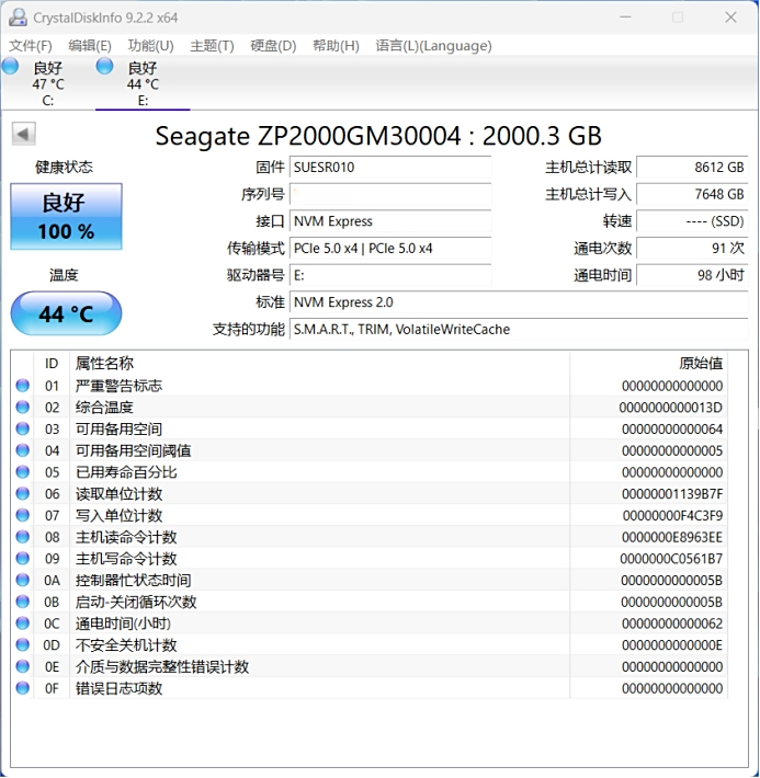 从CrystalDiskInfo软件我们可以了解测试硬盘的基本信息。我们此次测试的希捷酷玩540硬盘,支持PCle 5.0×4通道,理论带宽约为16GB/s。SSD固件版本为SUESR010,支持S.M.A.R.T、TRIM以及VolatileWriteCache功能,采用NVMe 2.0标准。由于这块盘之前经过了测试和使用,因此通电次数和读写都不是产品初始状态。