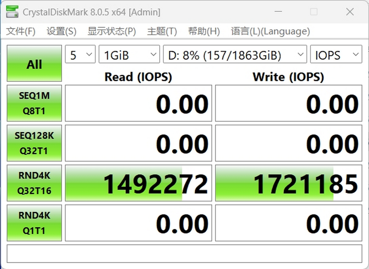 除了顺序读写性能,4K随机读写的性能对于很多琐碎小文件的存储、系统文件更新、网页缓存写入、大量图片拷贝等影响明显。在决定用户日常使用的4K随机读写测试中,酷玩540同样表现出了极为出色的性能。CrystalDiskMark 8.0.5软件测得其在Q32T16下,4K随机读取速度能够达到1492K IOPS,4K随机读取速度能够达到1721K IOPS,十分夸张。这也证明酷玩540很适合用来运行大体量游戏以及完成高负载创作任务。