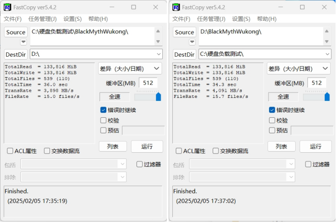 我们还通过对不同文件的传输来测试实际传输速率。游戏文件夹通常包含众多小文件,在拷贝时很考验硬盘性能。一个体量超过130GB的《黑神话:悟空》分别向酷玩540写入、读取(对象盘为PCIe 4.0 SSD),其传输速率均能维持在4GB/s,传输完成也仅需35秒左右。