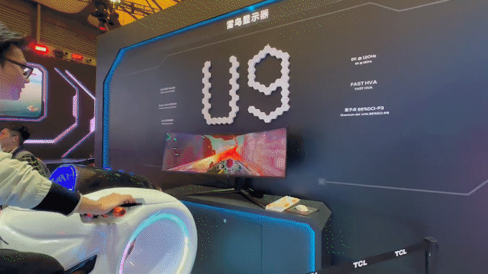 ??雷鸟U9的专属展位上搭配了一台极具科幻感的摩托体感控制器供参展观众体验,搭配具备超宽视野的U9显示器能够提供前所未有的沉浸体验。TCL华星此前在CJ?23上就有参数近似的显示产品展示,更多规格细节包括57吋对角线尺寸、7680*2160分辨率、R1000屏幕曲率等,可以猜测雷鸟U9就是其正式推向消费级市场的产品之一。笔者也期待能早日实测这款规格惊人的旗舰“带鱼屏”。