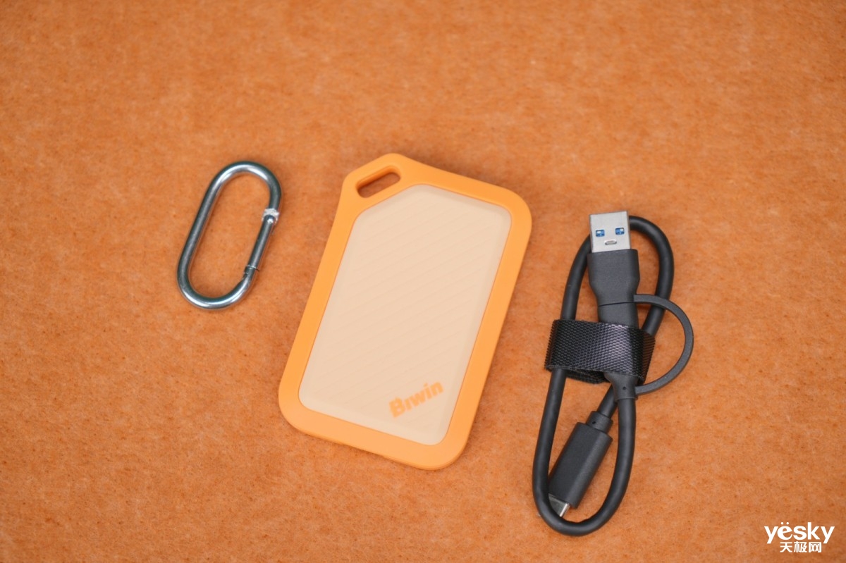 拆开包装,除了有佰维PR2000移动固态硬盘本体外,配件也非常实用,一根Type-C和Type-A二合一的数据线,可满足不同设备接口的连接需求,标配的登山扣在户外出行时可以将其挂在背包上,方便随取随用,不用担心丢失。
