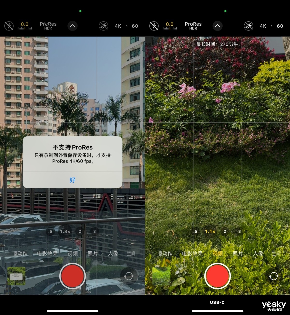 以iPhone 15 Pro为例,在未接入移动硬盘之前,手机提示不支持录制。当外接了佰维PR2000三防高速移动固态硬盘之后,在ProRes模式下,录制按键下方出现了“USB-C”标识,表示当前的存储模式为USB-C,所拍摄的素材也会直接存储到佰维PR2000中,顶部也显示了剩余空间可拍摄的时长。我们拍摄了一段大概1分钟左右的ProRes 4K 60帧视频,整个录制过程非常顺滑,实现边录边存,不占用手机内置空间。
