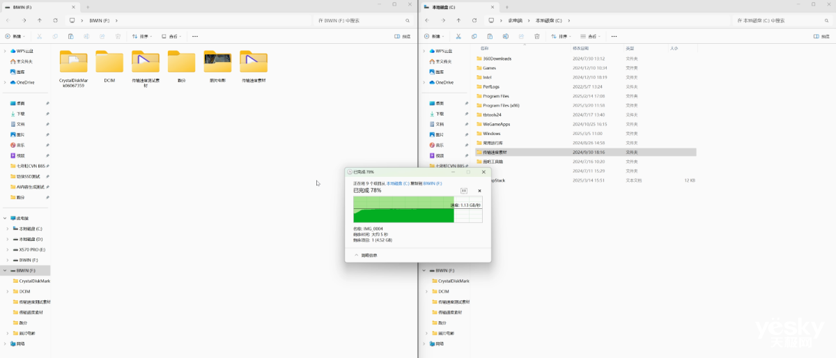 在文件实际传输测试中,我们将一个大概20.5GB大小的视频素材从电脑桌面拷贝到佰维PR2000中,实测其最高读取速度可以达到1.13GB/s左右,整体传输速度非常稳定,用时仅为18秒左右。