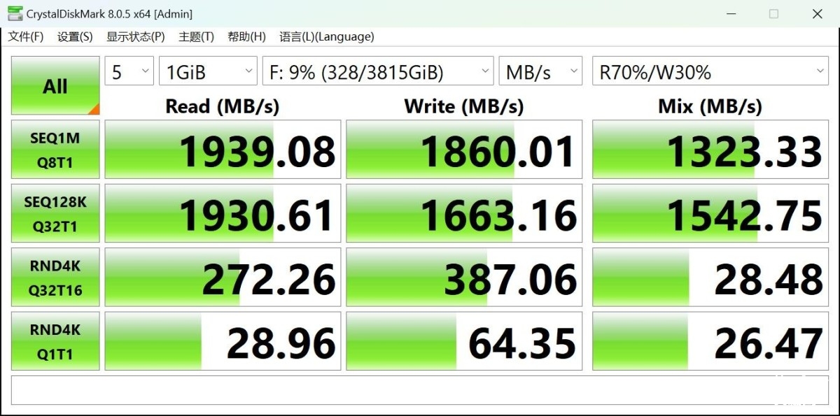 从CrystalDiskMark的数据看到深度队列Q8读写数据方面,佰维PR2000读速接近2000MB/s,写入速度超过官方标称的1800MB/s,性能表现还是很不错的。