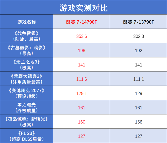 ??从结果上来看,酷睿i7-14790F靠着更大的三级缓存,在《战争雷霆》这样的网游上有着比较明显的提升,而大型单机游戏的提升则非常小了。而酷睿i5-14490F只有频率上的小幅变化,所以游戏性能基本没有差别。