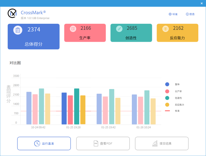 ??CrossMark的综合测试,它覆盖创造力、生产力和响应速度三大维度,其中生产率测试考察整机的文档编辑、表格处理、网页浏览性能;创造性则考察整机的图片编辑、图片组织、视频编辑性能;反应能力考察整机在程序启动、开启文件、多任务工作时的表现,能够很好的反映电脑日常事务的处理效率,主要是针对CPU性能的测试,得分为2374,很出色了。