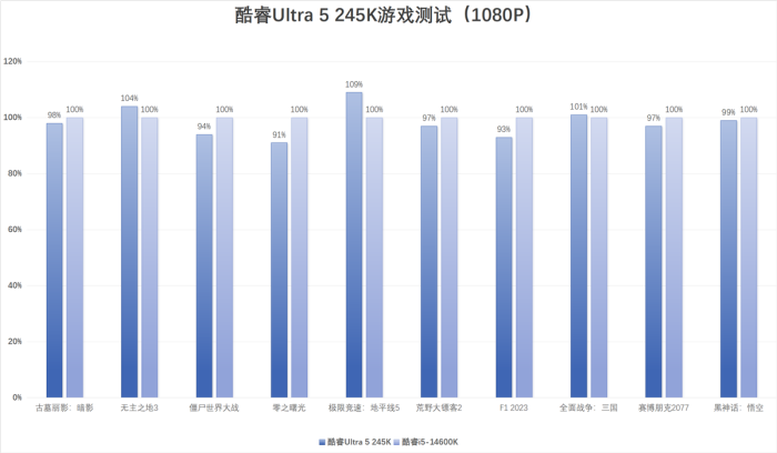 结果和酷睿Ultra 9 285K差不多,酷睿Ultra 5 245K和酷睿i5-14600K各有胜负,多数游戏基本持平,《极限竞速:地平线5》中的领先最多,达到了9%,《零之曙光》落后最多,同样最大差距没超过10%。