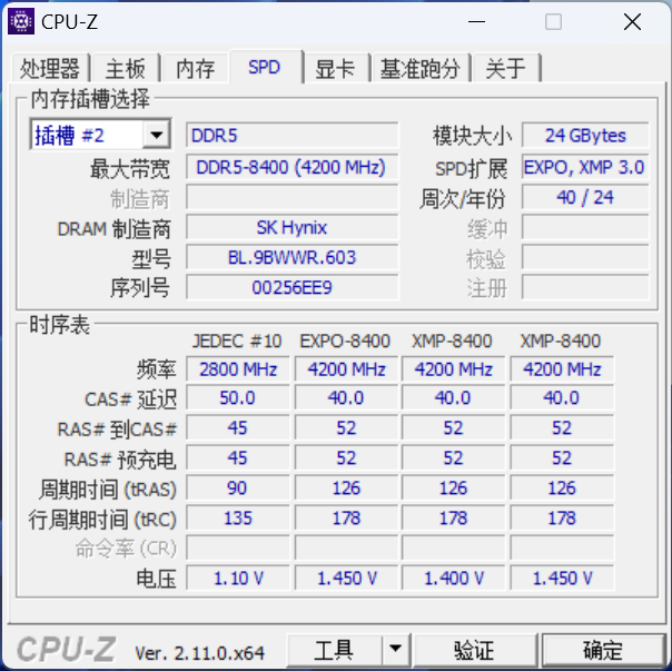 开启XMP后Hera内存工作在8400MT/s频率,时序为40-52-52-126 CR2。在SPD信息中可见,Hera内存采用SK海力士颗粒,支持XMP 3.0与EXPO技术,写入了基础的JEDEC-5600,以及一种EXPO-8400与两种XMP-8400信息,后两者的区别主要体现在内存电压分别设定为1.4V与1.45V。