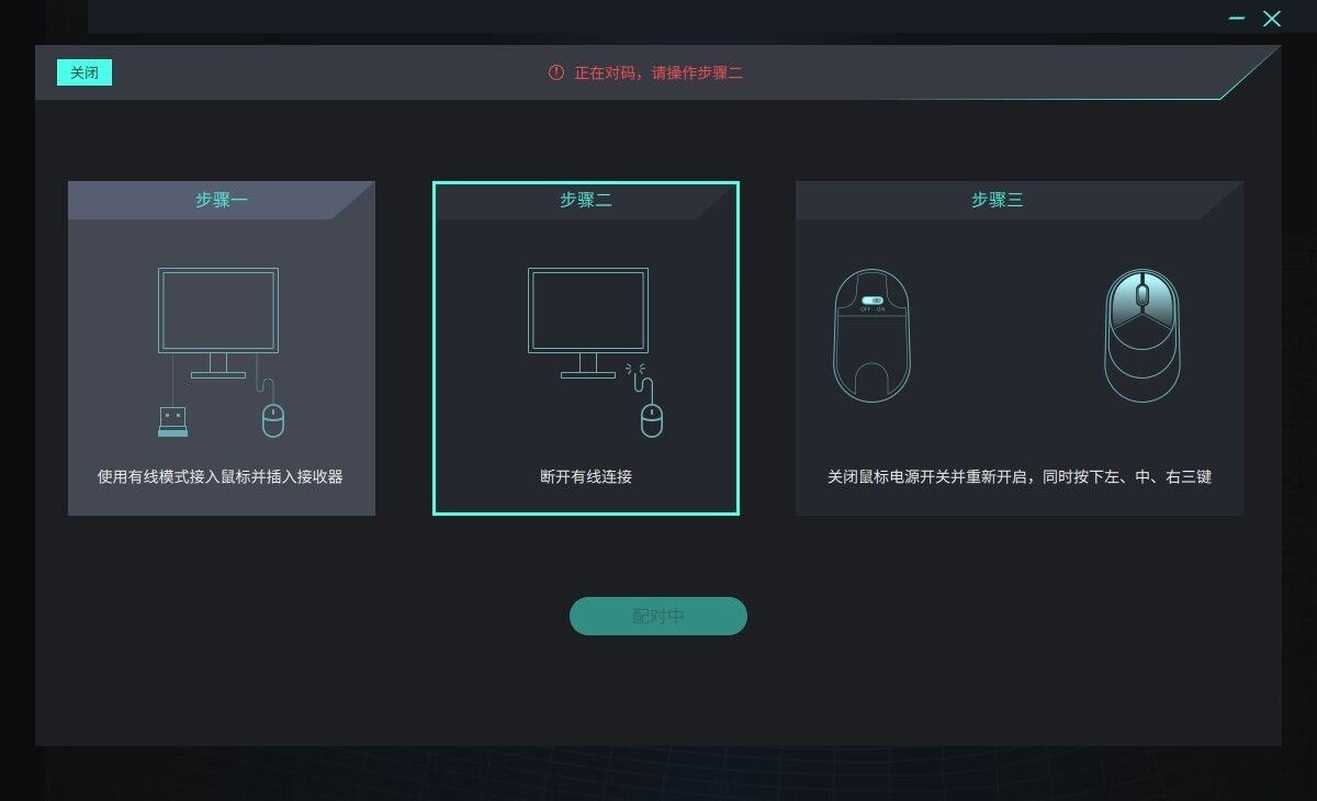 随后断开雷柏VT9鼠标的有线连接,关闭鼠标电源后再重新开启,同时按下鼠标鼠标左、中、右三键,直至驱动软件中出现“配对成功,可正常使用鼠标”的弹窗,即表示配对成功。