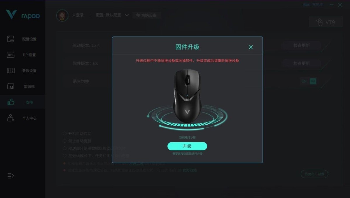 在具体的使用操作方面,由于雷柏V2M接收器的配对连接需要配合雷柏官方专属驱动软件来进行,因此我们在初次使用之前需要在官方网站下载最新版雷柏驱动软件,对雷柏VT9鼠标进行配对之后再将其固件升级到最新版本,这样才能实现雷柏V2M接收器与雷柏VT9鼠标的下一步配对连接操作。同时,这里需要提醒的是,升级过程中我们要将鼠标始终保持在有线连接状态。