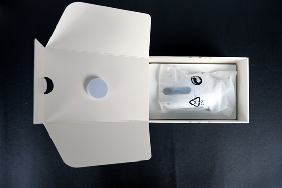 抽拉出装有产品本体的盒子并打开,内里设计了一块海绵来固定鼠标,除了鼠标本体,配件有说明书、一条USB编织数据线、一个Type-C to Type-A延长转换器、一套备用脚贴、一套防滑贴。