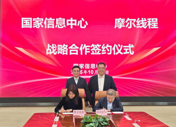 国家信息中心副主任周民与摩尔线程联合创始人兼首席运营官周苑代表双方签署战略合作协议