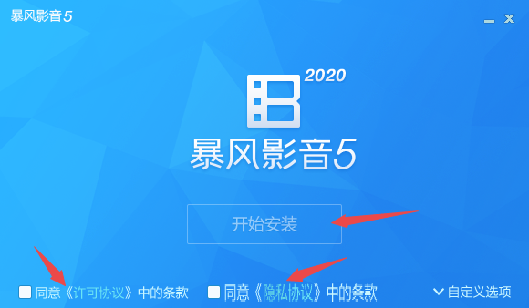 双击下载好的暴风影音5软件的安装包,然后勾选两个【同意】选项,并点击【开始安装】按钮即可。