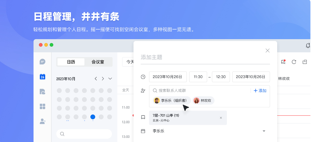 轻松规划和管理个人日程。摇一摇便可找到空闲会议室,多种视图一览无遗。