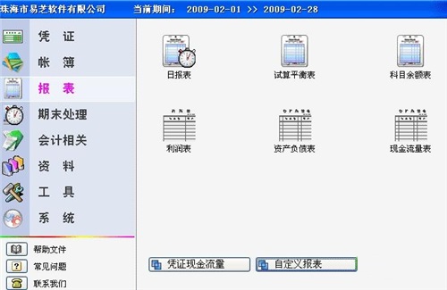 凭证编辑、打印、汇总、查找,总分类帐,明细帐,数量金额帐,辅助核算表,日记帐,试算平衡表,科目余额表,利润表,资产负债表,现金流量表,自定义报表,资产折旧计算等。