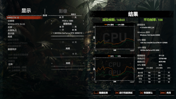 游戏测试中,笔者使用《古墓丽影·暗影》内置的性能测试工具,由于显卡为GeForce RTX 3050,所以笔者选择在1080P画面下,开启超强性能光追+DLSS测试。测试的平均帧数达到108,就算2K分辨率也可一战。