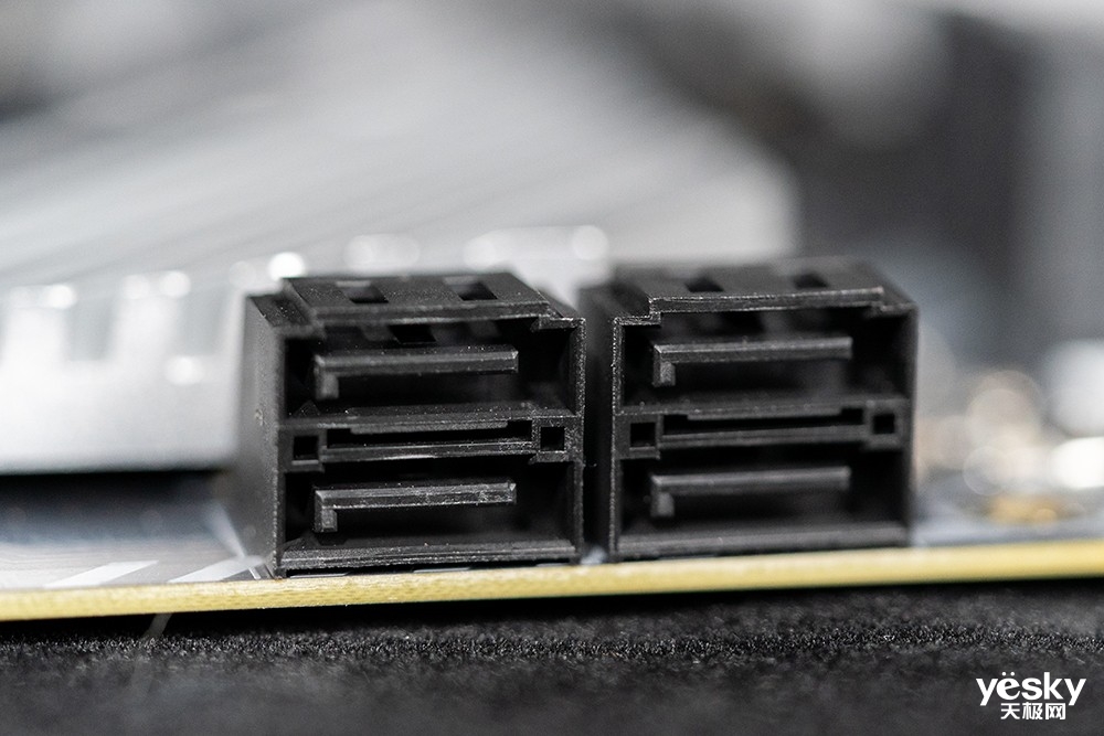 主板提供两个M.2固态硬盘接口,分别支持PCIe 4.0和PCIe 3.0速率,两个M.2插槽支持2242/2260/2280三种尺寸,散热装甲保证了固态硬盘的性能释放。七彩虹在主板左侧提供4个SATA3接口,支持RAID功能。