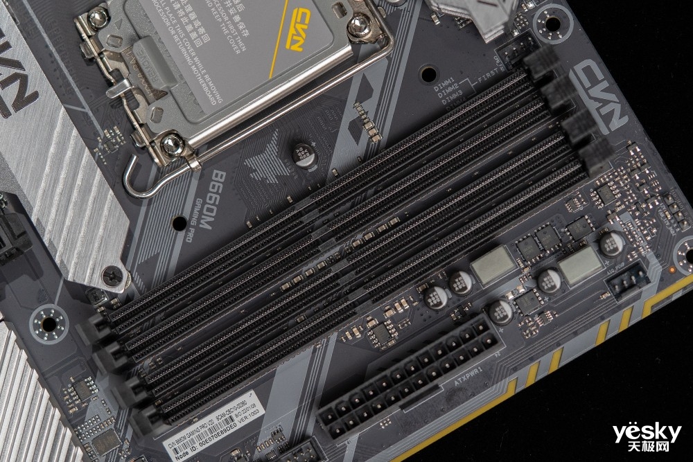 主板配备4条DIMM内存插槽,单插槽最高支持32GB的容量,最大容量可达128GB,最高频率可达4266MHz。主板配备一条PCIe 5.0 x16插槽,峰值传输带宽达128GB/s,采用金属加固插槽设计。