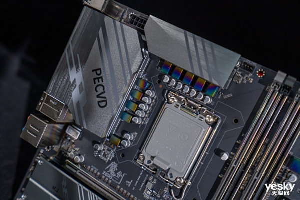 昂达Z690魔剑版主板设计10相数字供电,电路采用一上两下设计,上行MOSFET采用真茂佳ZM062N03,下行则是ZM045N03,电容均采用来自台湾的钰邦5K系列。为了让电脑持续稳定的运行,昂达为MOS管准备了大面积散热片,以提高供电的稳定性。