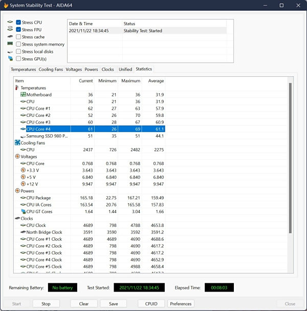 笔者最后使用AIDA64中内置的拷机软件对CPU进行稳定性测试。在测试之中,昂达魔剑Z690主板能不能满足酷睿i7-12700KF的使用需求?