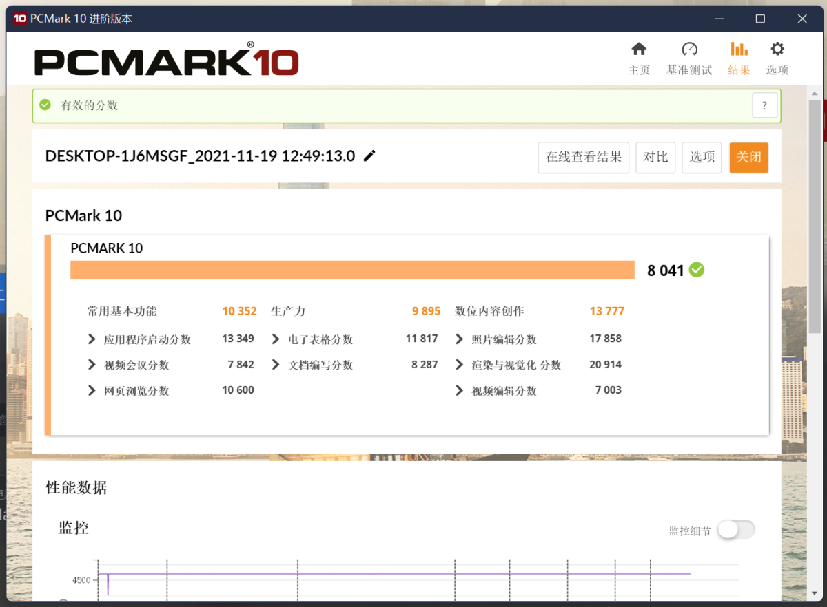 PCMark 10测试中,综合得分8041,基本功能10352分没生产9895分,数位内容创作13777分。