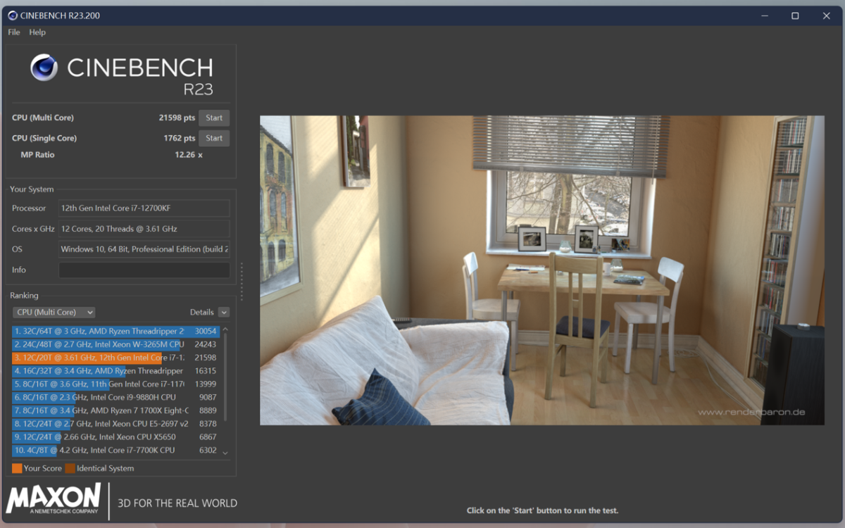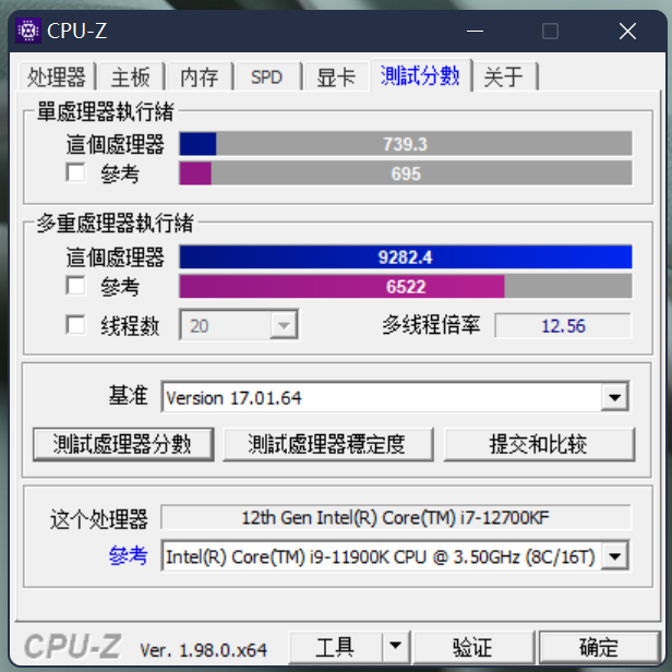 在CPU-Z的跑分中,Intel酷睿i7-12700KF的单核得分达到739.3分,比酷睿i9-11900K的695高6.3%;多核的分达9282.4分,比酷睿i9-11900K的6522分高42.3%。从跑分的结果可以看到,12代酷睿的单核性能提升比较常规,但得益于新架构和8 P-Cores和4 E-cores的设计,多核性能提升达42%。