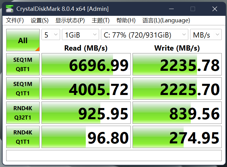CrystalDiskMark测试中,连续读取性能6697MB/s,写入速度2235MB/s并不出色,主要原因是固态硬盘占用率接近80%。在三星Performance Benchmark的测试中,连续读写分别达到6990MB/s和4881MB/s。