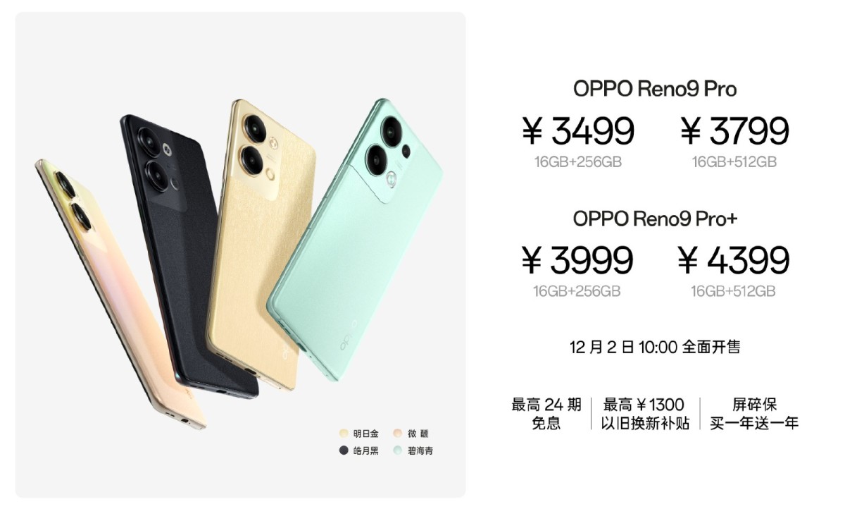 全新OPPO Reno9系列凭借超大内存结合旗舰级芯片,提供流畅顺滑体验,双芯组合带来人像质感升级以及全新设计轻薄高颜值外观吸引众多用户目光。OPPO Reno9系列共有Reno9 Pro+、Reno9 Pro与Reno9三个版本可选。价格方面,OPPO Reno9系列提供Reno9 Pro+、Reno9 Pro与Reno9三个版本。OPPO Reno9 Pro+提供明日金、皓月黑、碧海青三种配色,16GB+256GB版本售价3999元,16GB+512GB版本售价4399元;OPPO Reno9 Pro提供明日金、皓月黑、微醺三种配色,16GB+256GB版本售价3499元,16GB+512GB版本售价3799元;OPPO Reno9同样提供明日金、皓月黑、微醺三种配色,8GB+256GB版本售价2499元,12GB+256GB版本售价2699元,12GB+512GB版本售价2999元。 并将于12月2日正式发售,其中“万事红”新年配色将于12月10日发售。