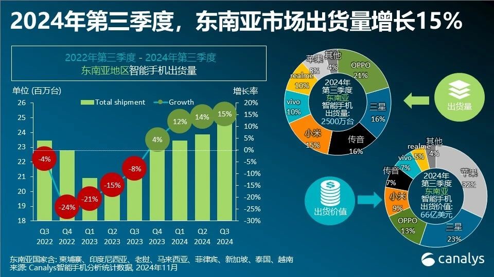 不过,分析师也表示出担忧,2024年第三季度东南亚地区虽然出货量增长,但平均售价下降了4%。价格下降的主要原因是中低端的新品上市量增加以及设备过度饱和,尤其是大众市场(100美元-300美元)的厂商,除了主打高性价比外很难实现差异化,因此严重依赖促销和折扣来推动销量。此外,旧机型的大幅折扣与新机型的上市造成了价格冲突,从而加剧了这一问题。这种 “价格战 ”越来越难以为继,分析师称原材料(BOM)的上涨和促销活动中的通胀成本正在挤压利润率,为了应对这些压力,厂商们正在整合入门级产品组合,以降低成本,实现更清晰的产品线。