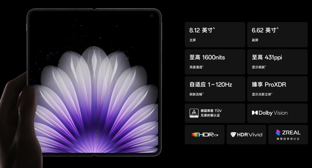 Find N5 配备 8.12 英寸主屏,内屏分辨率为QXGA+ 2480×2248,PPI高达431,支持 1–120Hz 自适应刷新率和 ProXDR 光影立体显示技术,峰值亮度高达 1600nit。外屏为 6.62 英寸 AMOLED 屏,分辨率为 FHD+(2616×1140),同样支持高亮度与高刷新率。双屏均通过 TÜV 无感折痕认证,有效减少折痕带来的观感影响。