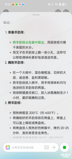 在菜谱等APP中,将直接可以通过识别图片,查询并制定菜谱所需材料、菜品的制作步骤、甚至细节到肉的处理方法和配菜建议,对于还在起步学习做菜的小伙伴小布语音助手将会是不错的帮手。