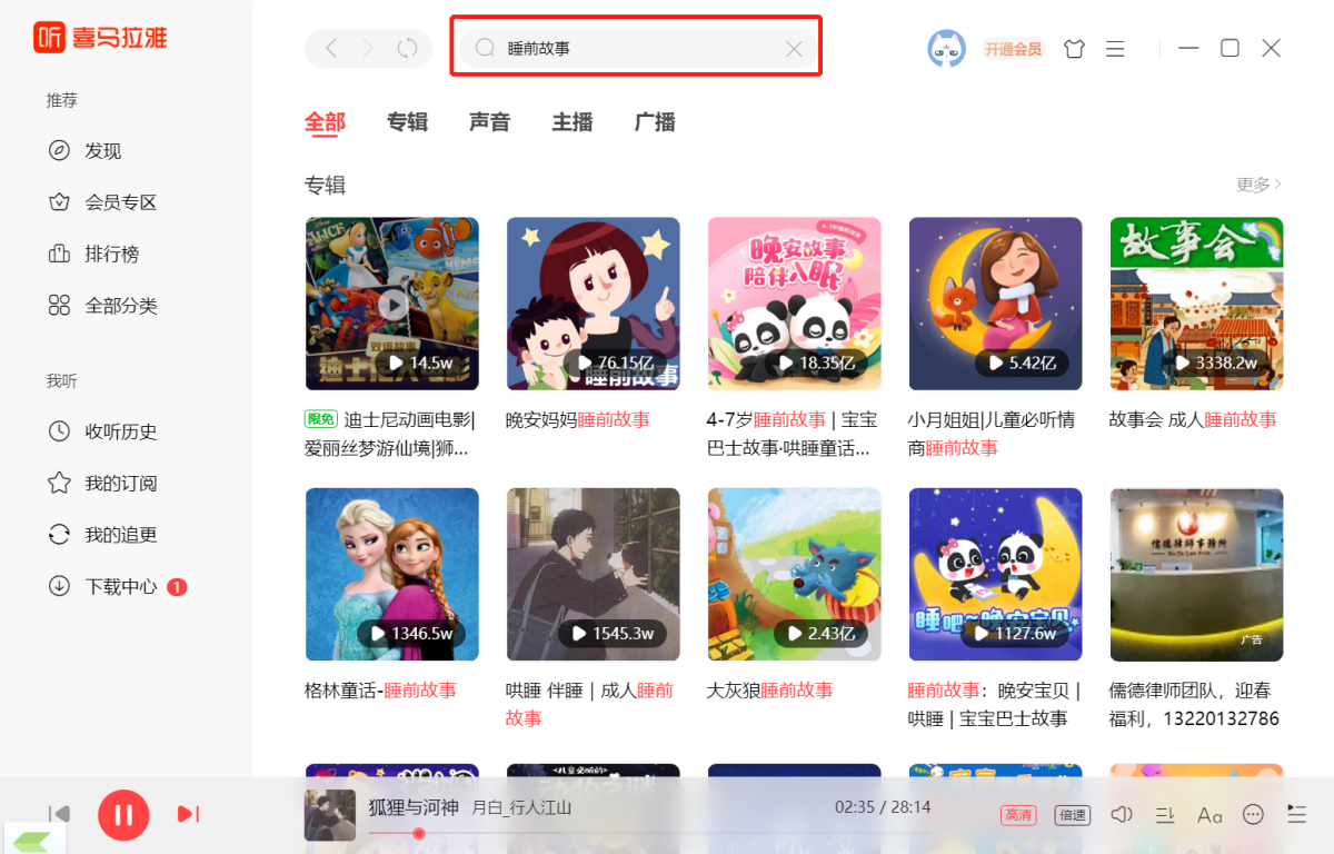 1、我们打开喜马拉雅,在搜索栏中搜索“睡前故事”即可得到众多关于睡前故事的合集。