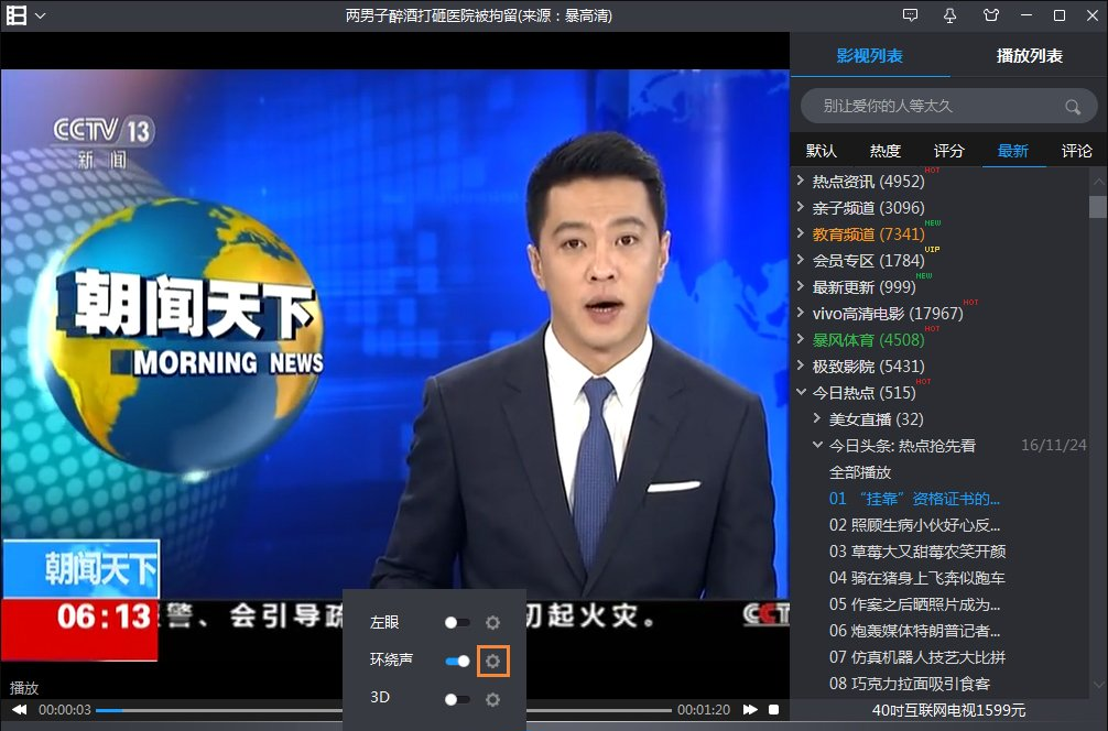 5、当上述两个功能都设置好以后,可以返回到视频播放的页面,体会一下这种环绕立体声的效果。