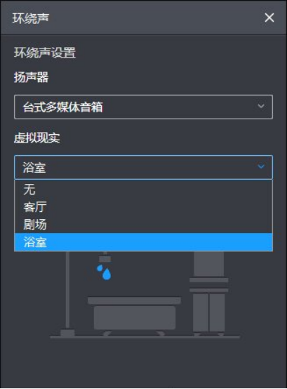 4、如果你使用的电脑设备,建议选择“台式多媒体音箱”作为扬声器的类型,设置完这个以后,下方还有一个“虚拟现实”的设置选项,点击下拉列表会出现客厅、剧场和浴室的环境效果,如果想要有立体环绕声的音效,建议设置成浴室或者剧场的效果,就会有一种带入感的体验。
