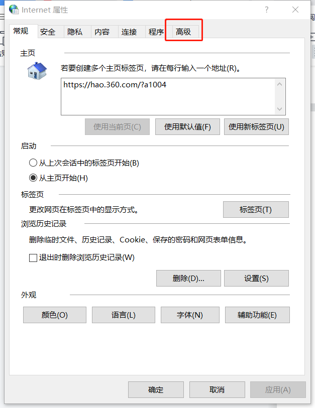 3、进入到internet选项的页面以后,最上方有常规、安全、隐私、内容、连接、程序,高级七个标签页,此时用鼠标点击最后一个“高级”标签页。