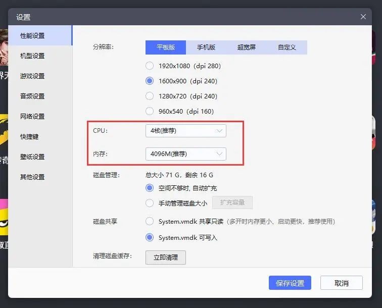 2、在左侧的“性能设置”页面中把CPU核数和运行内存调整到四核以及4096m或以上,然后再点击保存并重启雷电模拟器。?